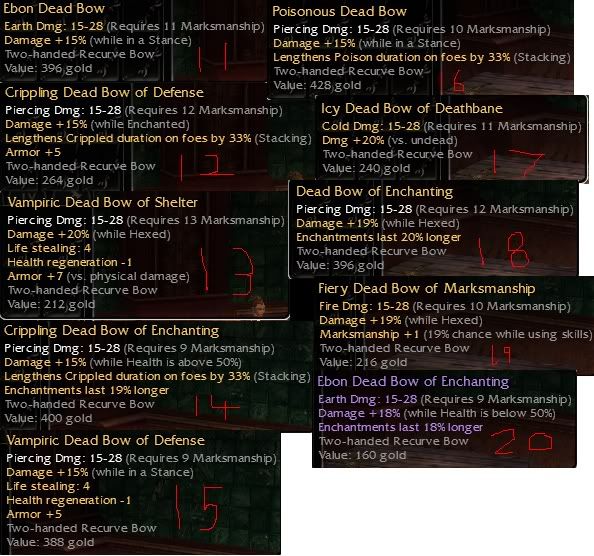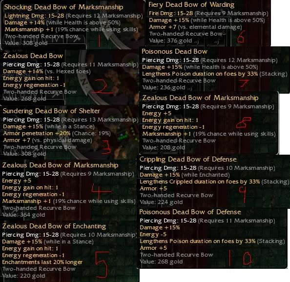 DDark Mav Ascalonian Squire Reap W/MoJoined Oct 2006Aug 15, 2007 at 3:09 PM • #1hi soz have alot of dead bows from last few runs and was wondering what prices on them where. Here is links: http://i5.photobucket.com/albums/y16...ddeadbows1.jpg http://i5.photobucket.com/albums/y16...ddeadbows2.jpg ty very much, a few i think are good and few i know are bad but ty in advance